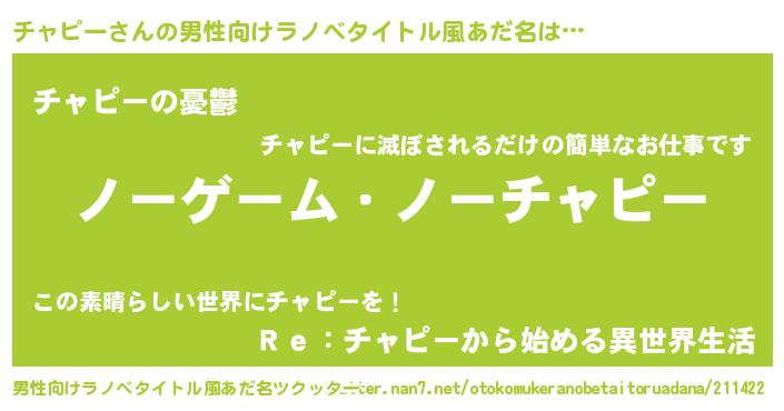 | 女子向けラノベタイトル風あだ名 | 『死神チャピーの再婚』『闇のチャピー』 |