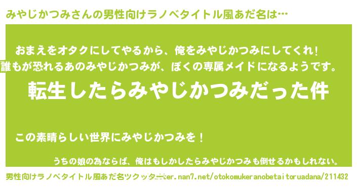 | 女子向けラノベタイトル風あだ名 | 『婚約破棄系悪役みやじかつみに転生したので、保身に走りました。』 |