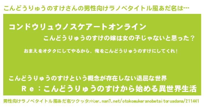 | 女子向けラノベタイトル風あだ名 | 『こんどうりゅうのすけ夫妻のなれそめ』 |