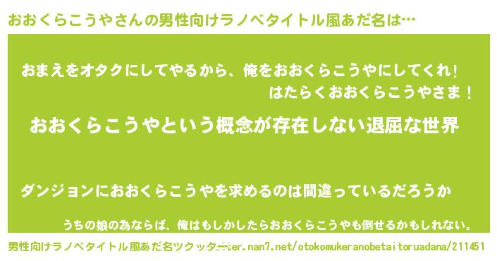 | 女子向けラノベタイトル風あだ名 | 『異世界で失敗しない100のおおくらこうや』 |
