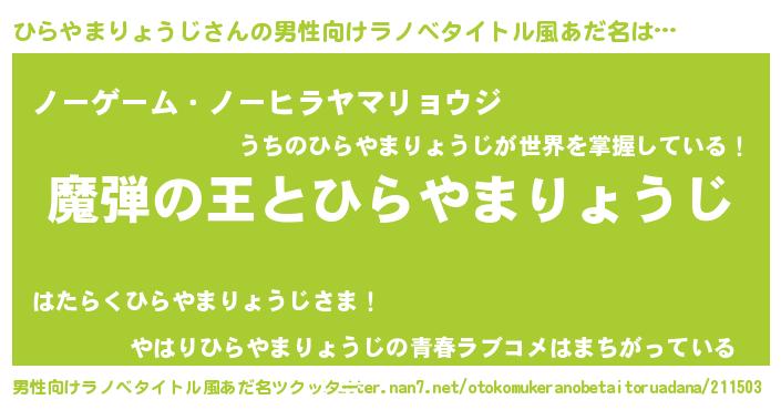 | 女子向けラノベタイトル風あだ名 | 『乙女ゲームの破滅フラグしかない悪役ひらやまりょうじに転生してしまった…』 |