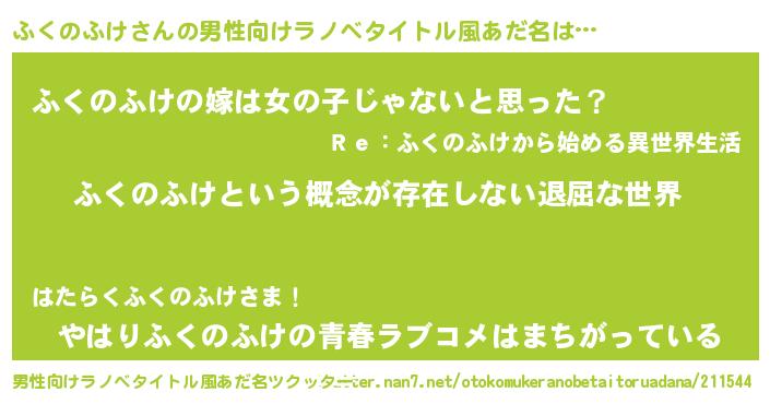 | 胡散臭い通販商品みたいなあだ名 | 『絶対に幸福をもたらす水素水…その名も「ふくのふけ」』 |