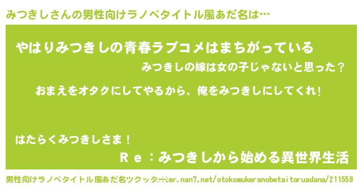 | 女子向けラノベタイトル風あだ名 | 『みつきし夫妻のなれそめ』 |