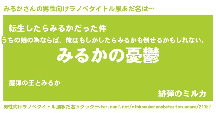 | 女子向けラノベタイトル風あだ名 | 『(仮)みるかのやんごとなき事情』 |