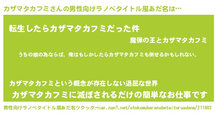 | 女子向けラノベタイトル風あだ名 | 『カザマタカフミの婚約者』 |