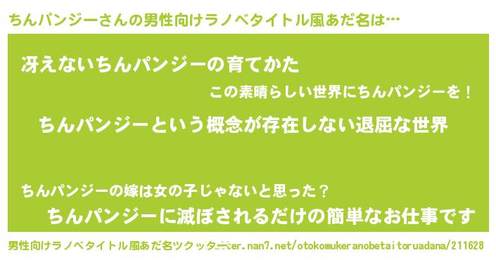 | 女子向けラノベタイトル風あだ名 | 『異世界で失敗しない100のちんパンジー』 |