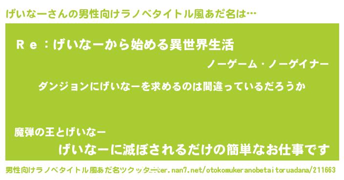 | 女子向けラノベタイトル風あだ名 | 『げいなーは平凡を望む』 |