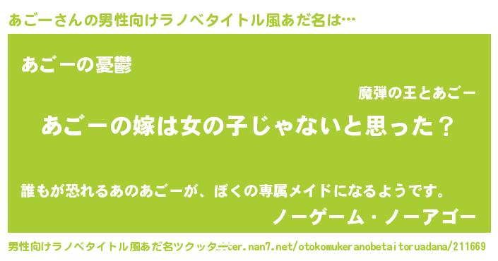| 女子向けラノベタイトル風あだ名 | 『あごー様がみてる』『死神あごーの再婚』 |