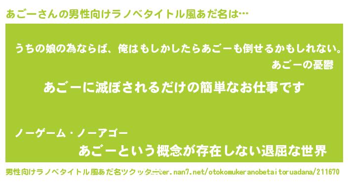 | 意味不明あだ名 | 『あごーフォーエバー』『永久保存あごー』 |