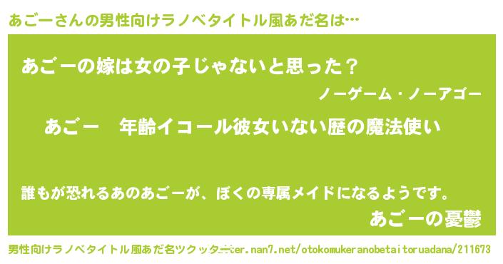 | 女子向けラノベタイトル風あだ名 | 『あごーの玉の輿計画!』『あごー恋絵巻』 |