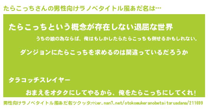 | 女子向けラノベタイトル風あだ名 | 『たらこっちは平凡を望む』 |