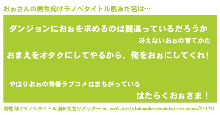 | 女子向けラノベタイトル風あだ名 | 『おぉ恋絵巻』『おぉの卵を拾いまして』 |