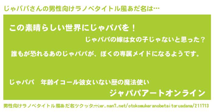 | 胡散臭い通販商品みたいなあだ名 | 『来世でも幸せになれる健康食品…その名も「じゃパパ」』 |