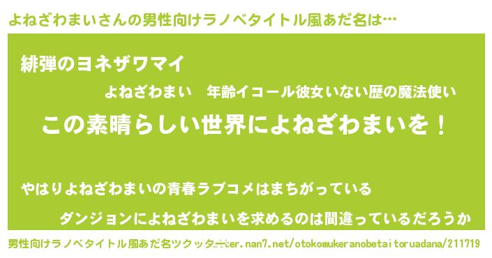 | 女子向けラノベタイトル風あだ名 | 『悪役よねざわまいに転生したようですが、知った事ではありません』 |
