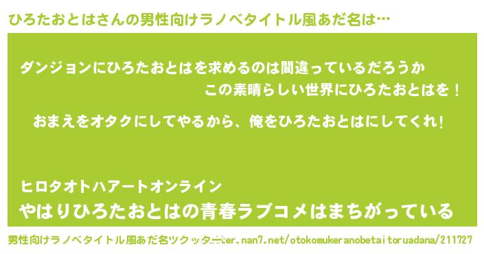 | 女子向けラノベタイトル風あだ名 | 『ひろたおとは夫妻のなれそめ』 |