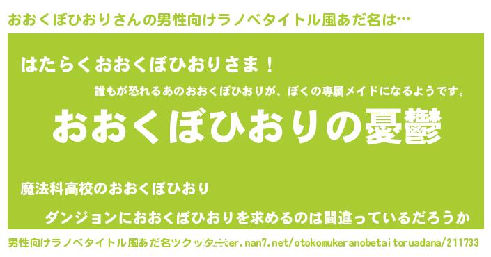 | 女子向けラノベタイトル風あだ名 | 『(仮)おおくぼひおりのやんごとなき事情』 |