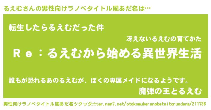 | 女子向けラノベタイトル風あだ名 | 『るえむストレイドッグス』 |
