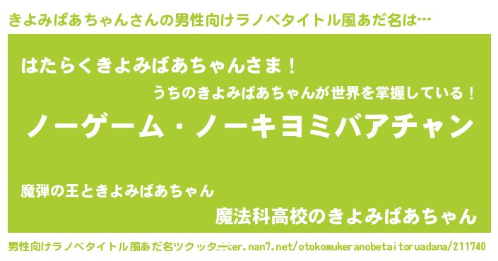 | 女子向けラノベタイトル風あだ名 | 『死神きよみばあちゃんの再婚』 |