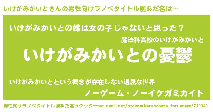 | 女子向けラノベタイトル風あだ名 | 『(仮)いけがみかいとのやんごとなき事情』 |