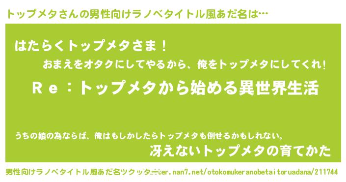 | 女子向けラノベタイトル風あだ名 | 『闇のトップメタ』 |