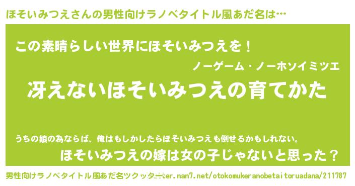| 胡散臭い通販商品みたいなあだ名 | 『世界中を虜にした100年もののヴィンテージワイン…その名も「ほそいみつえ」』 |
