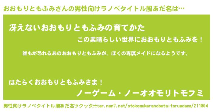 | 女子向けラノベタイトル風あだ名 | 『異世界でカフェおおもりともふみを開店しました。』 |