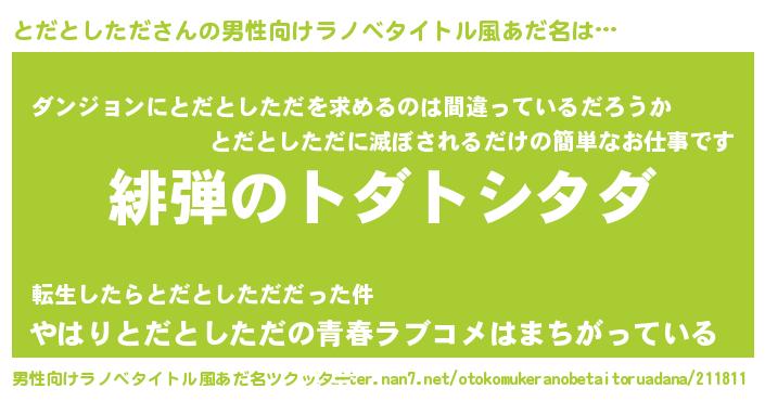 | ヒーロー風カッコイイあだ名 | 『暗黒騎士トダ』『スーパートダトシタダ』 |