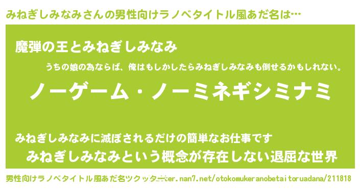 | 女子向けラノベタイトル風あだ名 | 『死神みねぎしみなみの再婚』 |