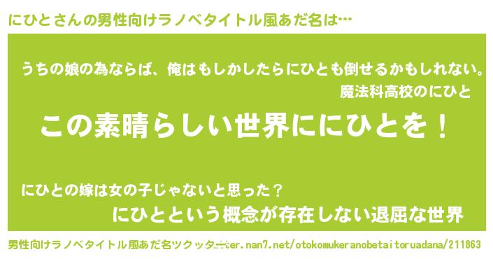 | 胡散臭い通販商品みたいなあだ名 | 『あなたにだけ特別に提供する世界で10本だけ現存している希少なブランデー…その名も「にひと」』 |