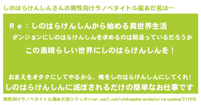 | 胡散臭い通販商品みたいなあだ名 | 『あなたにだけ特別に提供する限定10本のレアな日本酒…その名も「しのはらけんしん」』 |