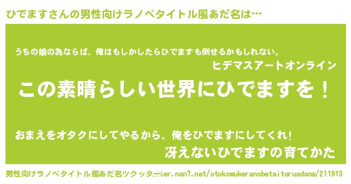 | 女子向けラノベタイトル風あだ名 | 『悪役ひでますに転生したようですが、知った事ではありません』 |