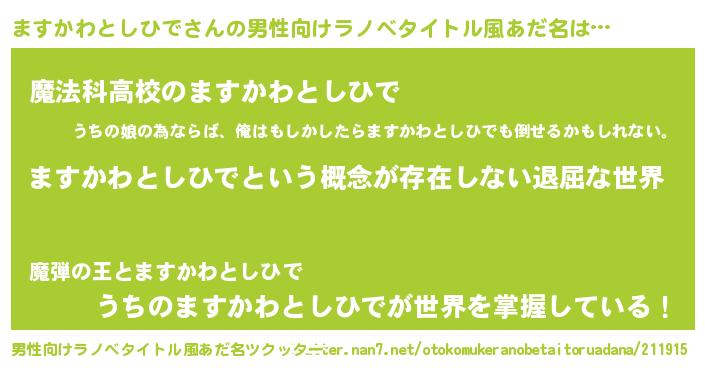 | 女子向けラノベタイトル風あだ名 | 『異世界で失敗しない100のますかわとしひで』 |