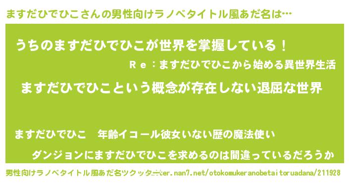 | 女子向けラノベタイトル風あだ名 | 『異世界で失敗しない100のますだひでひこ』 |