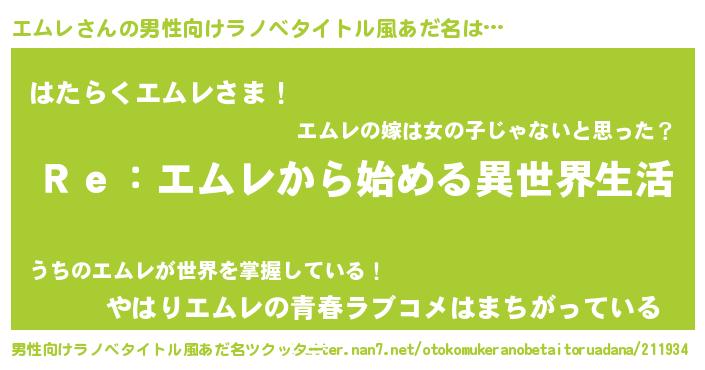 | 自動車の名前っぽいあだ名 | 『メルエムス・エンツ』『ランエムギーニ』 |