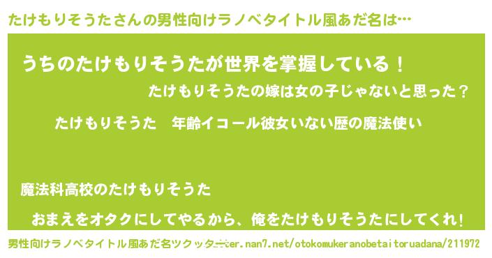 | 女子向けラノベタイトル風あだ名 | 『たけもりそうたの玉の輿計画!』 |