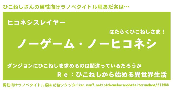 | 女子向けラノベタイトル風あだ名 | 『死神ひこねしの再婚』 |