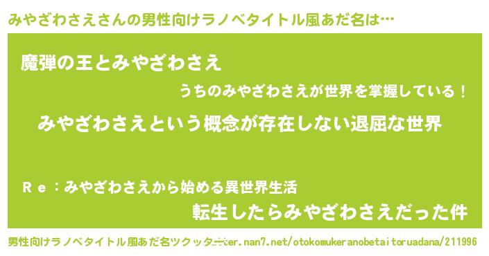 | 女子向けラノベタイトル風あだ名 | 『異世界で失敗しない100のみやざわさえ』 |