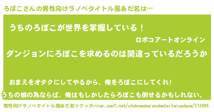 | 胡散臭い通販商品みたいなあだ名 | 『信頼と実績のサプリメント…その名も「ろぼこ」』 |