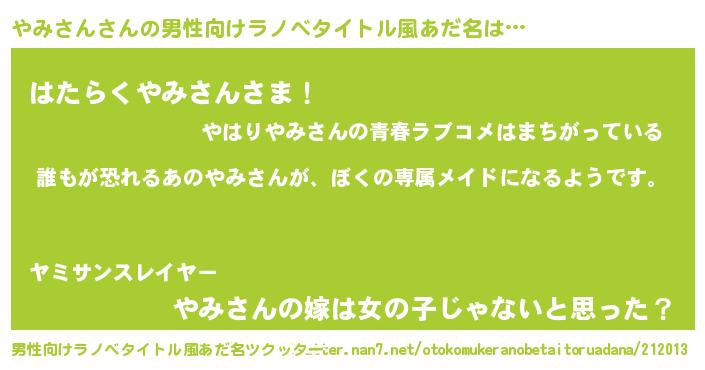 | 胡散臭い通販商品みたいなあだ名 | 『来世でも幸せになれる健康食品…その名も「やみさん」』 |