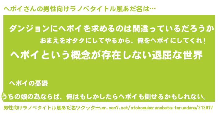 | 胡散臭い通販商品みたいなあだ名 | 『絶対に幸福をもたらす健康食品…その名も「ヘボイ」』 |