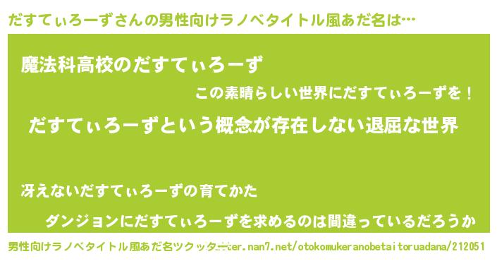 | 女子向けラノベタイトル風あだ名 | 『異世界で失敗しない100のだすてぃろーず』 |