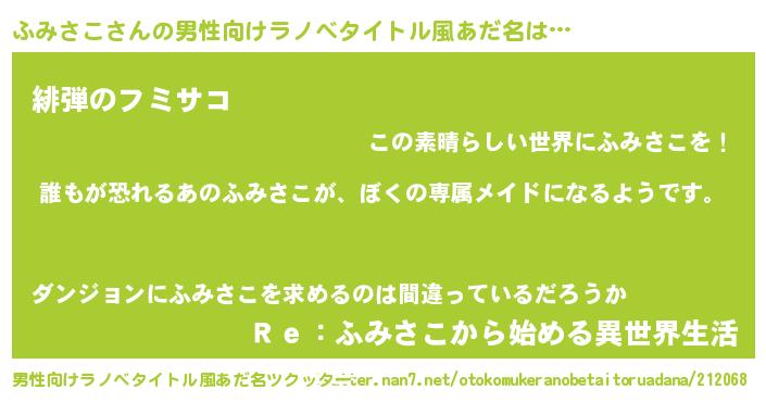 | 女子向けラノベタイトル風あだ名 | 『異世界でカフェふみさこを開店しました。』 |