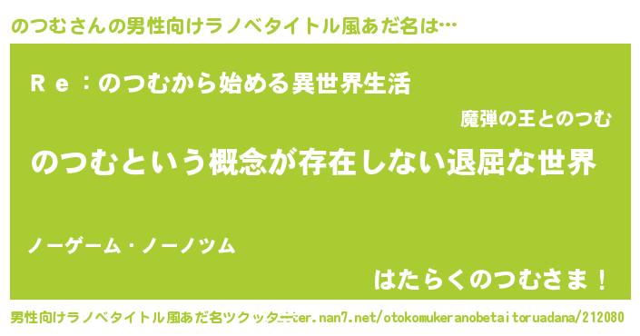 | 女子向けラノベタイトル風あだ名 | 『異世界で失敗しない100ののつむ』 |
