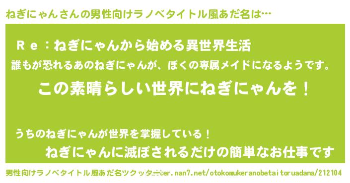 | 女子向けラノベタイトル風あだ名 | 『悪役ねぎにゃんに転生したようですが、知った事ではありません』 |