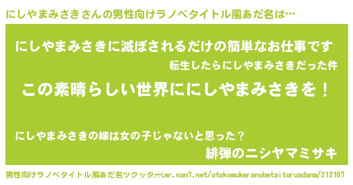 | 意味不明あだ名 | 『住所不定無職にしやまみさき(77歳)』 |