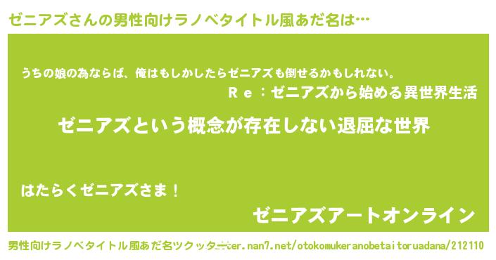 | 胡散臭い通販商品みたいなあだ名 | 『来世でも幸せになれる水素水…その名も「ゼニアズ」』 |