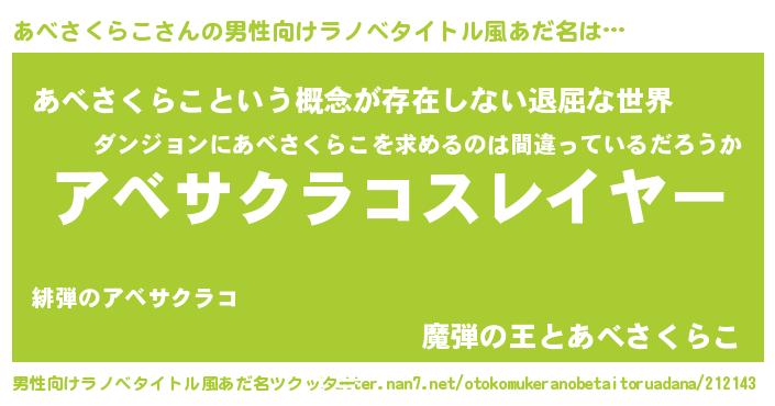 | 女子向けラノベタイトル風あだ名 | 『婚約破棄系悪役あべさくらこに転生したので、保身に走りました。』 |