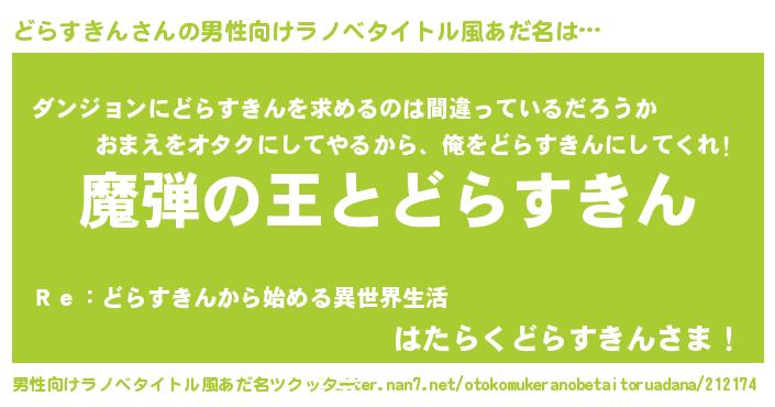 | 女子向けラノベタイトル風あだ名 | 『乙女ゲームの破滅フラグしかない悪役どらすきんに転生してしまった…』 |