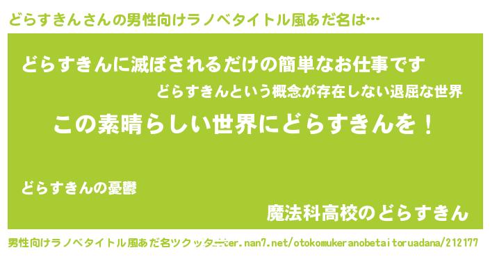 | 女子向けラノベタイトル風あだ名 | 『悪役どらすきんに転生したようですが、知った事ではありません』 |