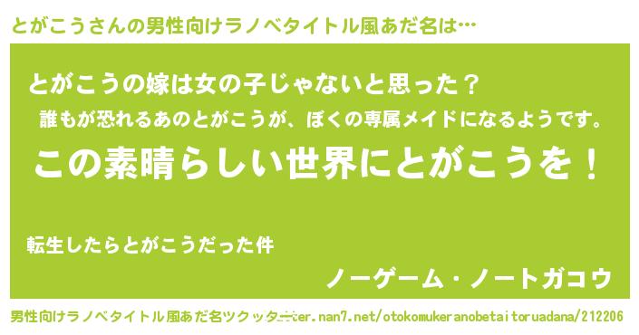 | 女子向けラノベタイトル風あだ名 | 『悪役とがこうに転生したようですが、知った事ではありません』 |